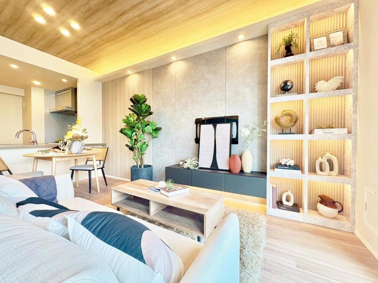 キッチン新規交換、ユニットバス新規交換、トイレ新規交換、クロス張替、フローリング張替、間接照明